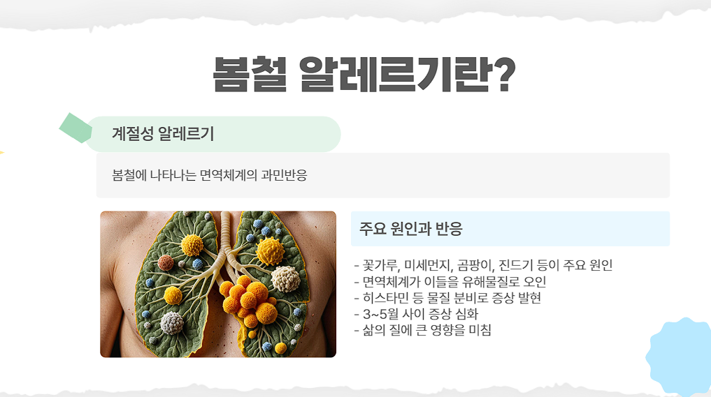 따뜻한 봄이 오면 설레는 마음과 함께 찾아오는 불청객이 있습니다. 바로 봄철 알레르기입니다. 꽃이 피고 미세먼지가 많아지는 시기, 코는 막히고 눈은 간질간질해지는 경험, 많은 분들이 공감하실 거예요. 이번 글에서는 봄철 알레르기의 원인부터 증상, 실생활에서 실천할 수 있는 예방법까지 하나하나 친절하게 알려드릴게요.