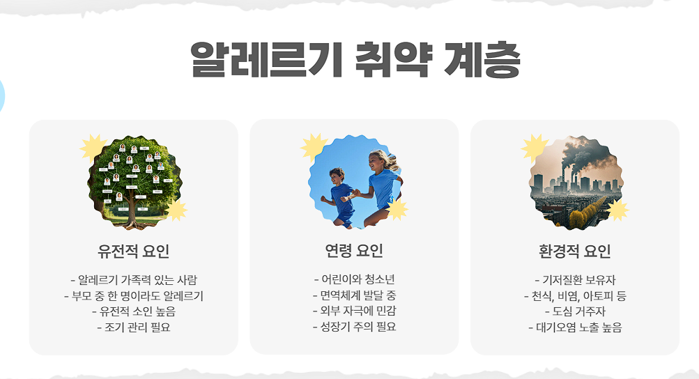 - 어린이와 청소년: 면역체계가 아직 완전히 발달되지 않았기 때문에 외부 자극에 예민하게 반응합니다.