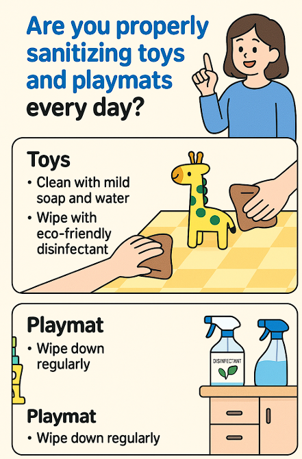 - 주 1~2회: 모든 장난감, 놀이 매트 전체